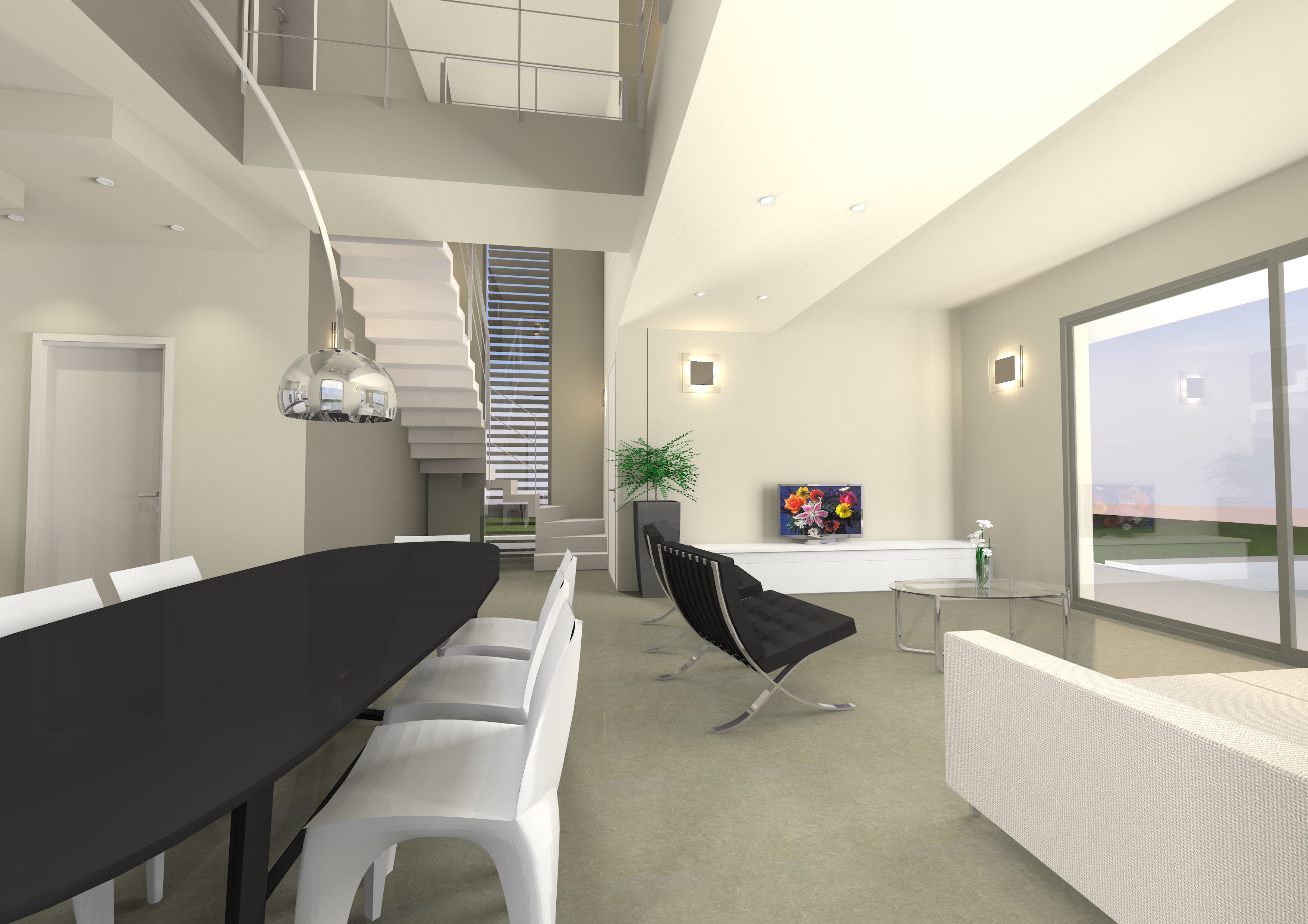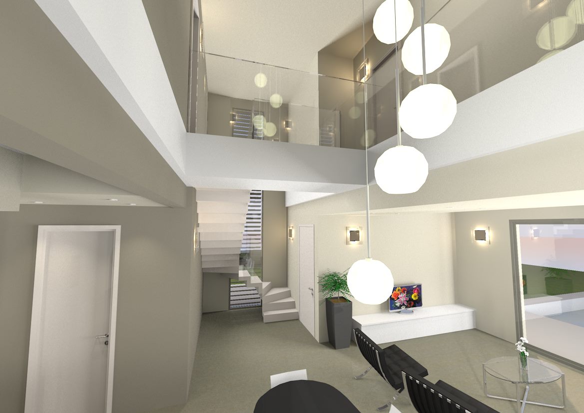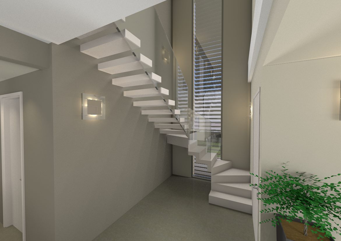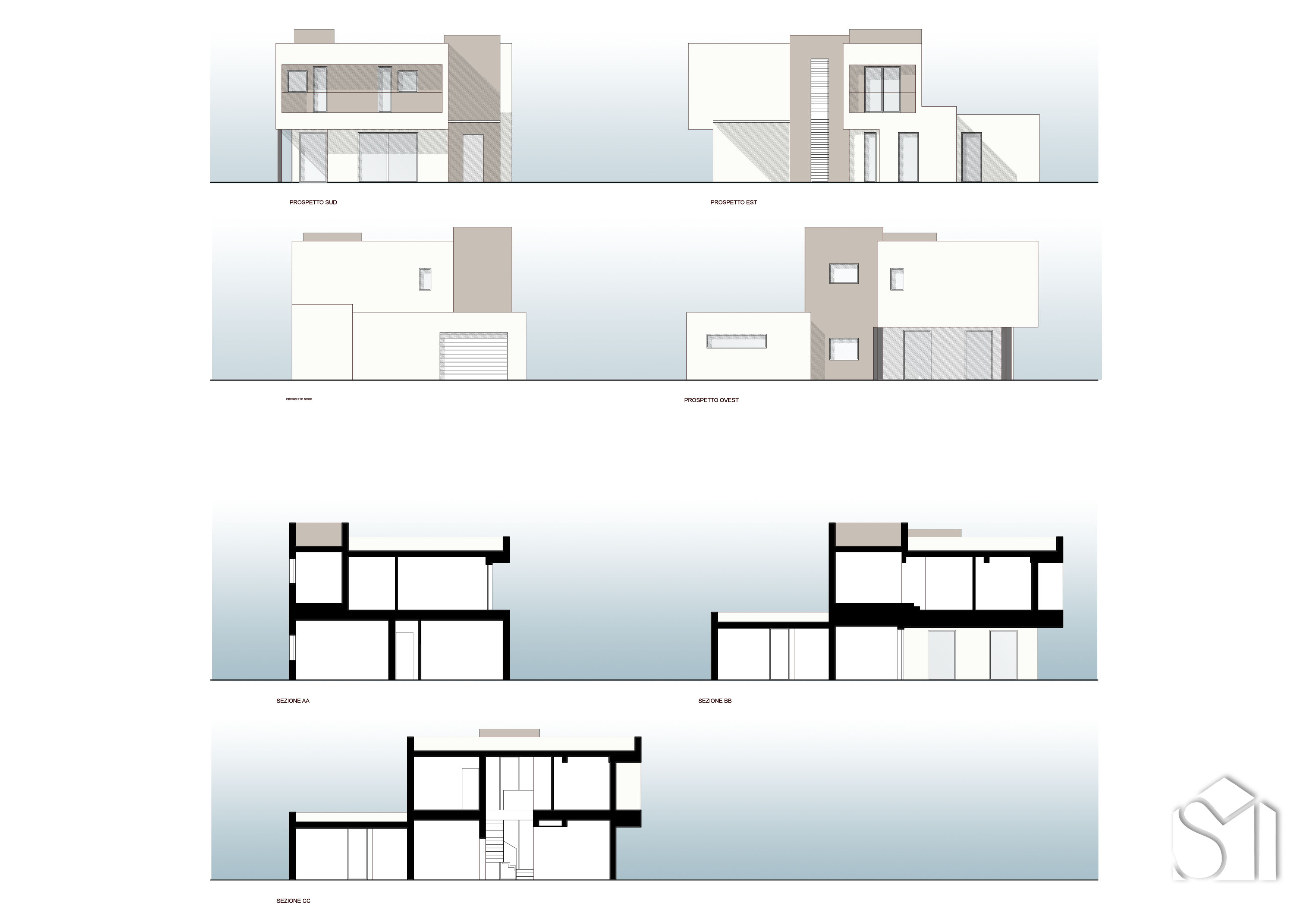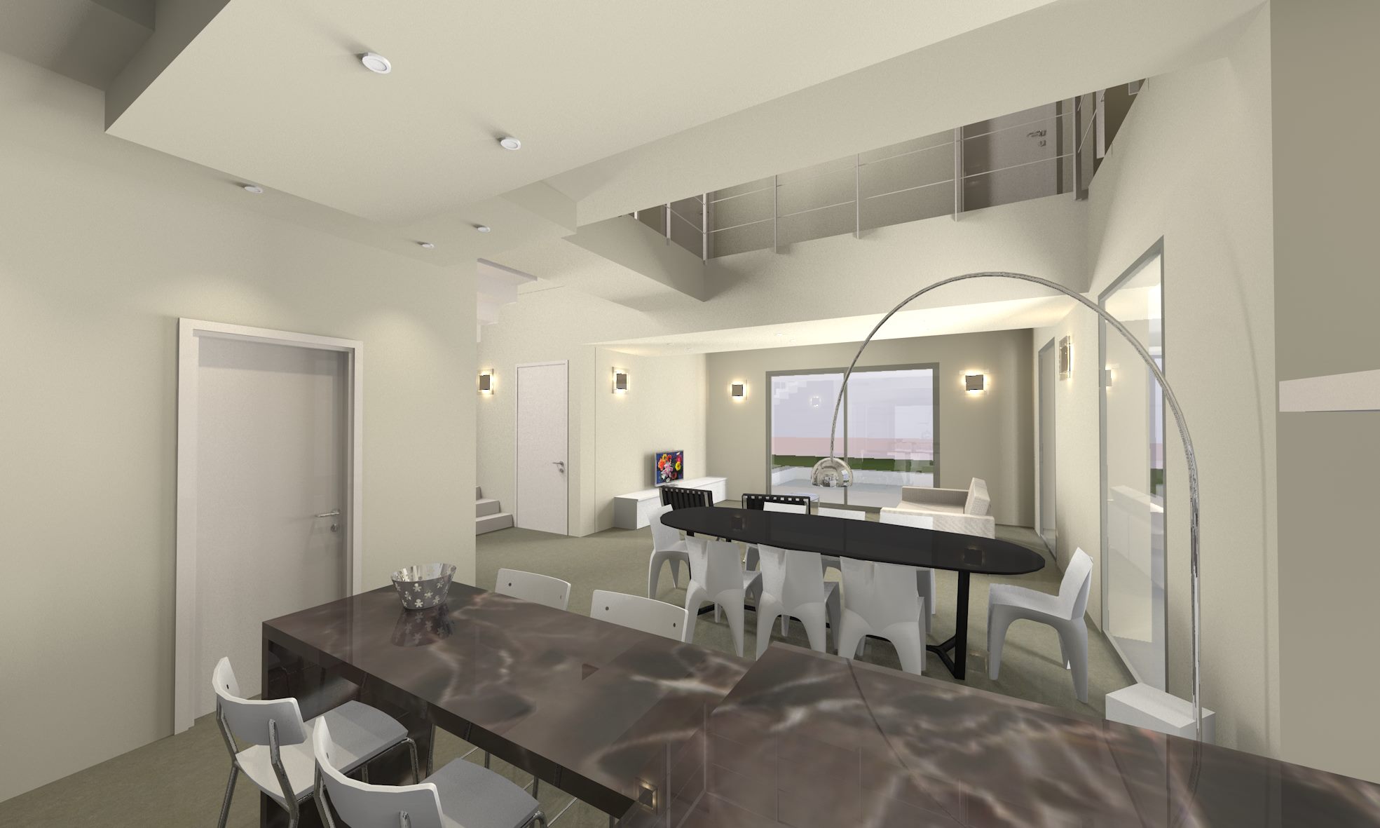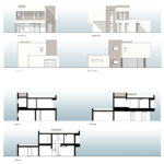 Per quanto riguarda la distribuzione spazio-funzionale, il piano terra è occupato dalla grande zona giorno, soggiorno con cucina a vista, e da qualche locale accessorio, autorimessa, lavanderia, locale tecnico, e infine dal bagno e da una camera ospiti. Ciò che caratterizza lo spazio giorno è sicuramente la doppia altezza che lo sovrasta e su cui si affacciano i ballatoi di distribuzione del piano primo. Al piano superiore ci sono le camere da letto, i bagni, uno dei quali a uso esclusivo della camera padronale, e un suggestivo studiolo posizionato in leggero sovralzo, in quella che appare dall’esterno come una torretta. Anche il corpo che contiene le scale appare da fuori come un parallelepipedo più alto del resto della casa e caratterizzato da un alto frangisole che scherma la vetrata da cui prendono luce l’ingresso e la scala.
