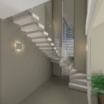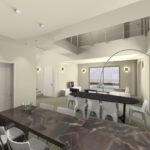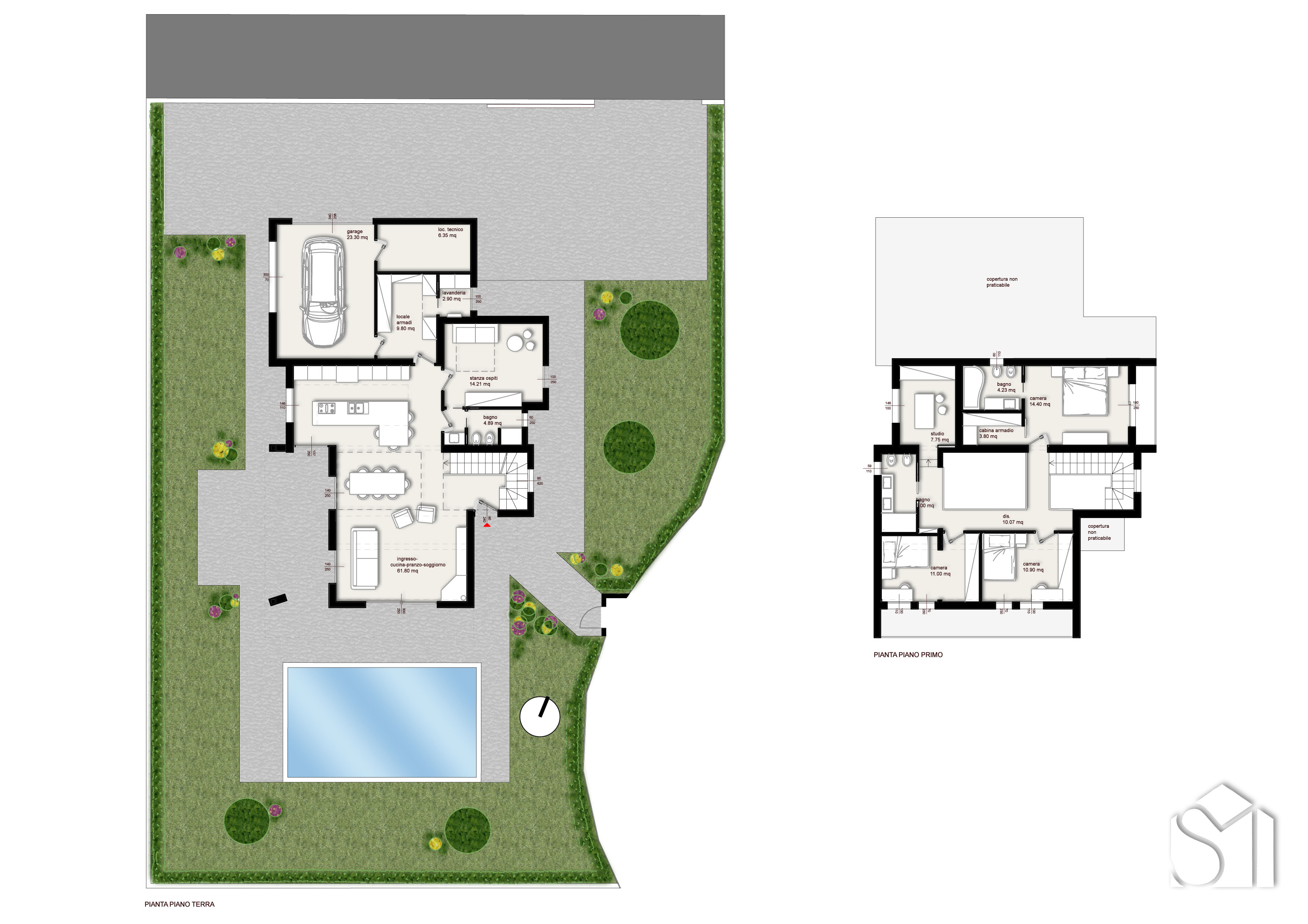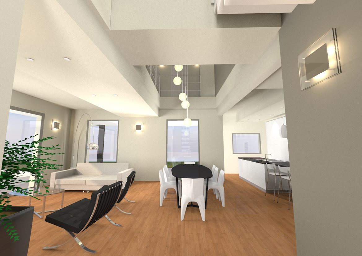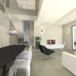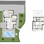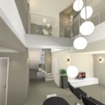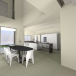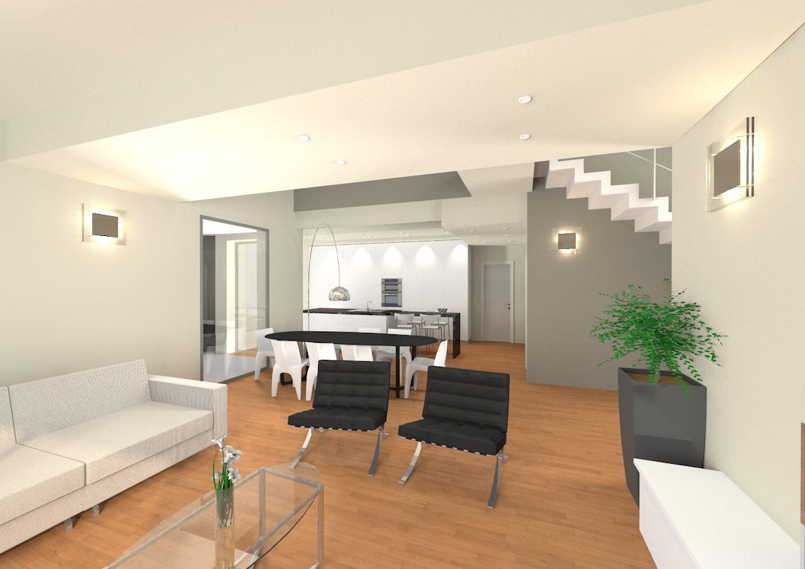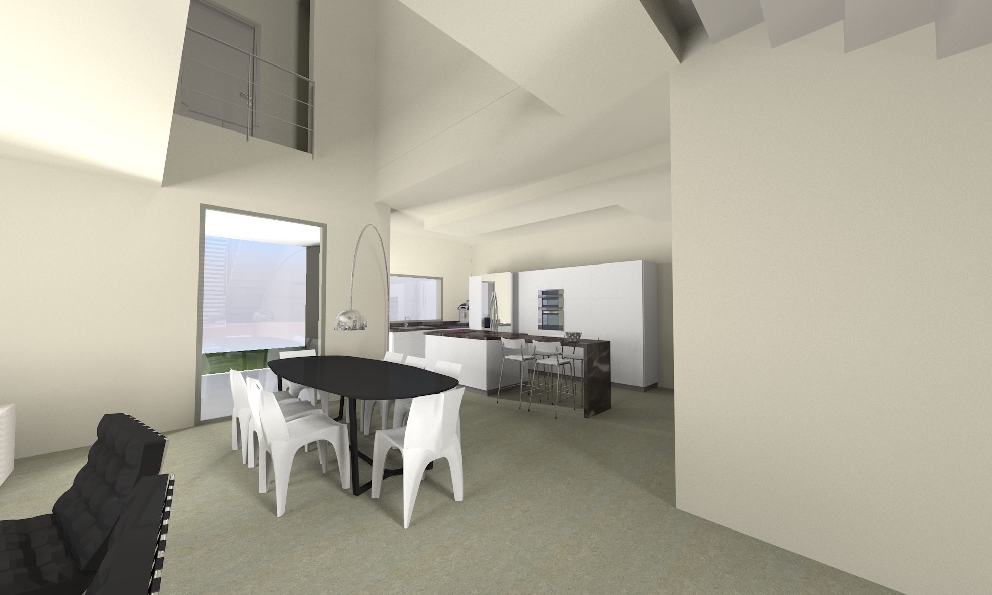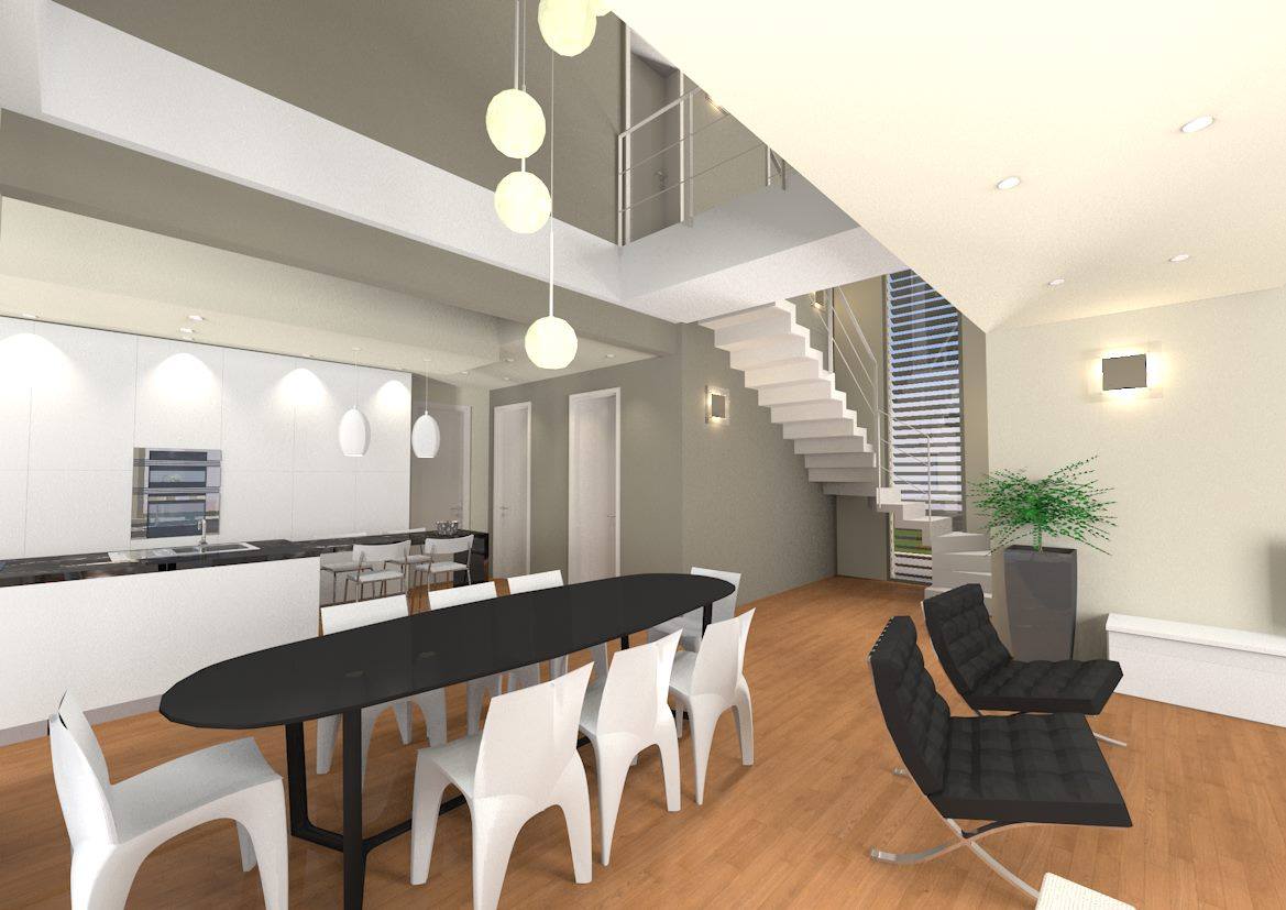 Per quanto riguarda la distribuzione spazio-funzionale, il piano terra è occupato dalla grande zona giorno, soggiorno con cucina a vista, e da qualche locale accessorio, autorimessa, lavanderia, locale tecnico, e infine dal bagno e da una camera ospiti. Ciò che caratterizza lo spazio giorno è sicuramente la doppia altezza che lo sovrasta e su cui si affacciano i ballatoi di distribuzione del piano primo. Al piano superiore ci sono le camere da letto, i bagni, uno dei quali a uso esclusivo della camera padronale, e un suggestivo studiolo posizionato in leggero sovralzo, in quella che appare dall’esterno come una torretta. Anche il corpo che contiene le scale appare da fuori come un parallelepipedo più alto del resto della casa e caratterizzato da un alto frangisole che scherma la vetrata da cui prendono luce l’ingresso e la scala.