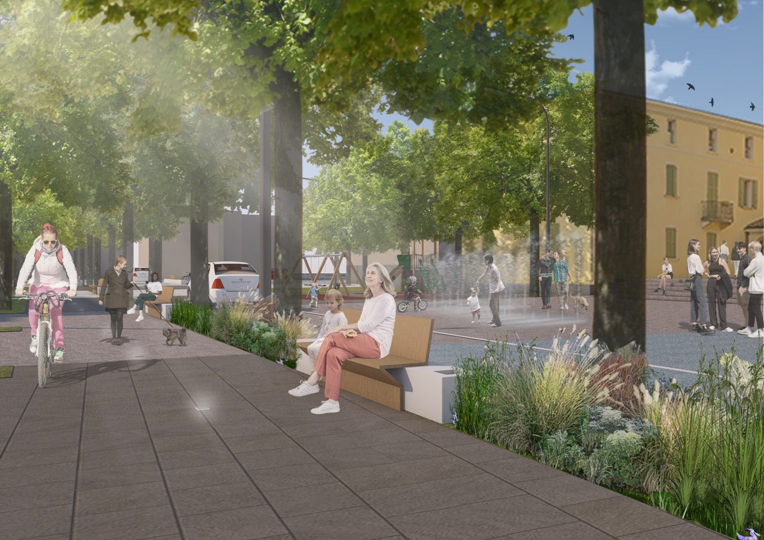 Si è pensato anche all’importanza del rapporto con la natura, oltre agli alberi già esistenti, si sono volute introdurre altre parti verdi (compatibilmente con la necessità di avere molti spazi carrabili per le piazzole di sosta del mercato settimanale) e inserire altre tipologie di piante e arbusti in aiuole ai lati del viale alberato (in particolare graminacee ornamentali, alcune delle quali perenni, a bassa manutenzione e non particolarmente bisognose di luce). L’introduzione di aree verdi contribuisce all’abbassamento della temperatura dell’aria e alla riduzione dei livelli di CO2, garantendo inoltre una maggiore biodiversità e una ricchezza a livello percettivo di colori, odori e sensazioni. Non si è voluto inserire altri alberi alti per lasciare la massima visibilità e riconoscibilità ai tigli esistenti, come elementi della memoria.