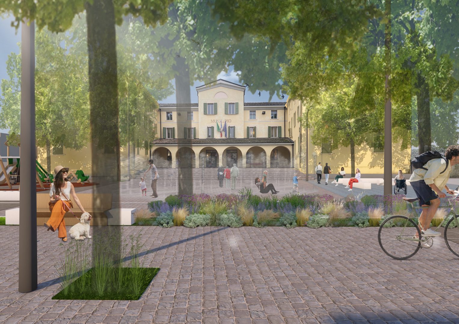 Un altro elemento naturale che caratterizza le zone agricole sono i canali per l’irrigazione dei campi. In questo caso la connessione con l’acqua avviene attraverso due momenti: di fronte al municipio verranno installati dei getti d’acqua coreografici e “di rappresentanza”, che costituiranno un polo d’attrazione sia per bimbi che per ragazzi nelle calde giornate estive, quale momento ludico, mentre verrà installata una vasca d’acqua, anch’essa attrezzata con sedute e stalli per le biciclette, in prossimità delle vasche a verde.