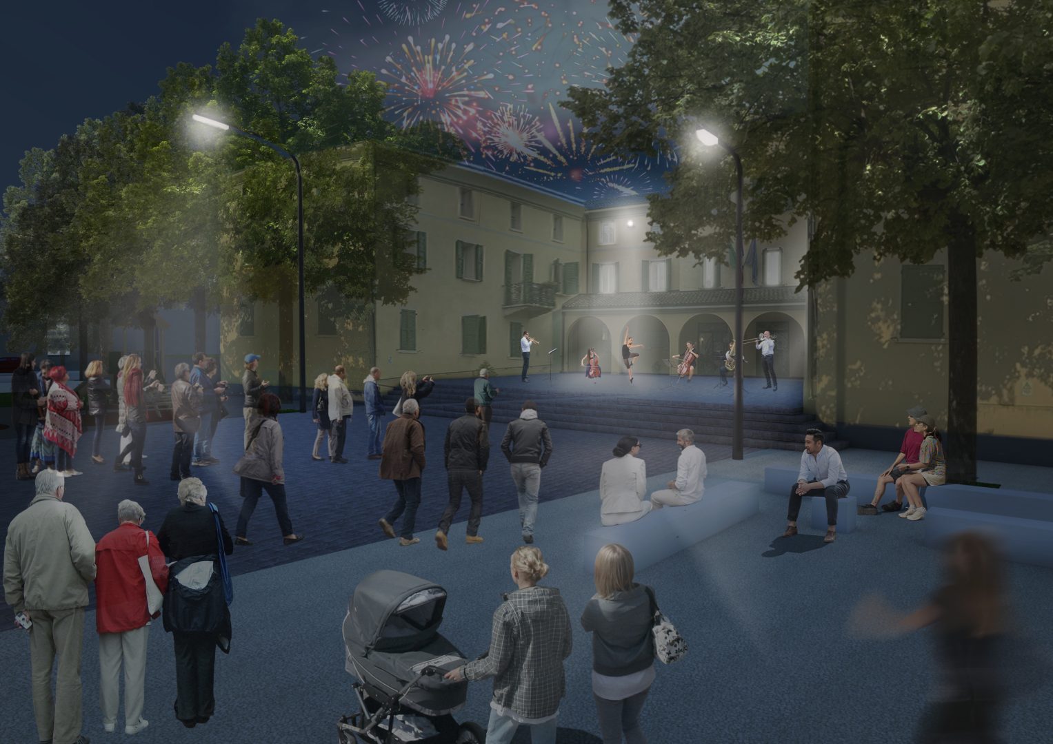 Lo spazio antistante al municipio è stato lasciato volutamente libero per permetterne un uso ad “arena” per eventi, feste e spettacoli e fungerà da platea, mentre lo spazio sopraelevato del municipio potrà essere adibito a palcoscenico.