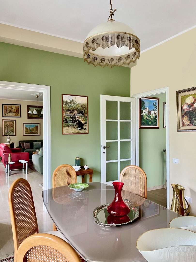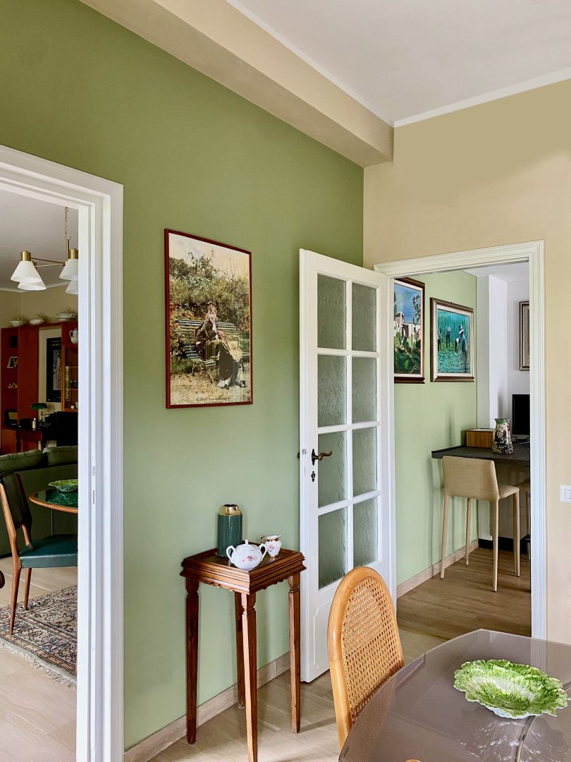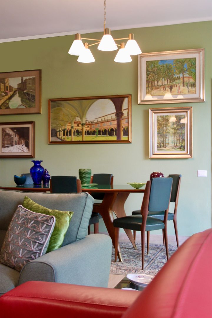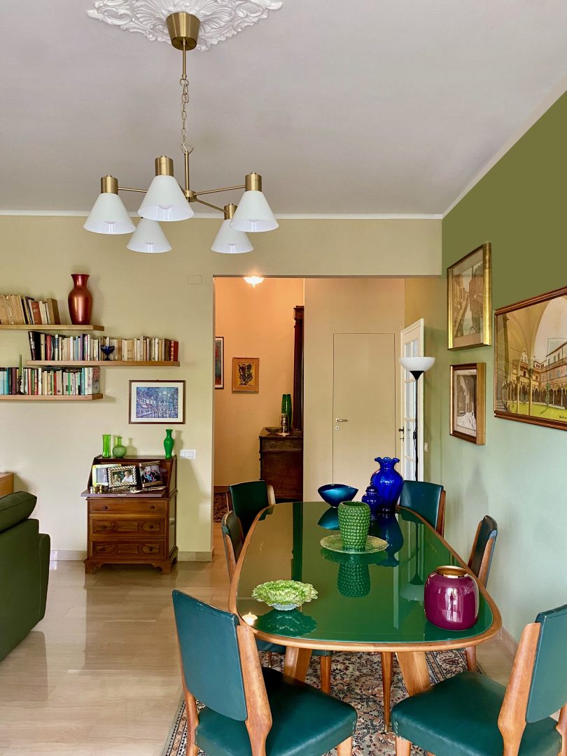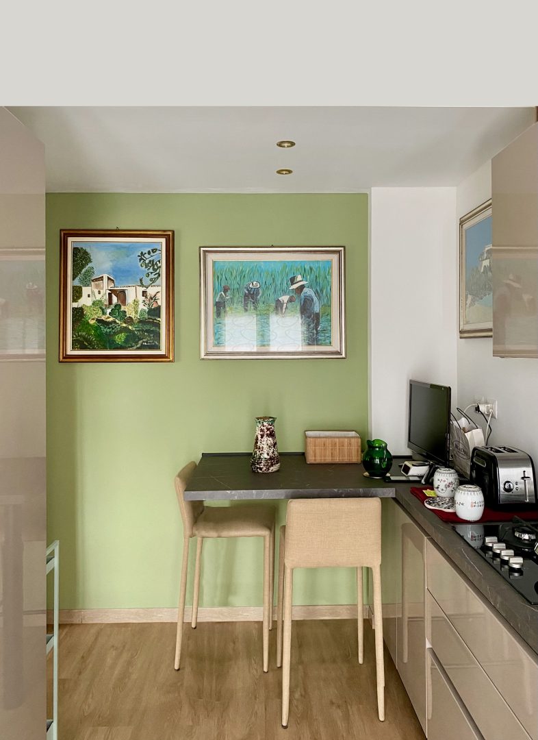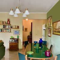 Siamo partite dagli arredi, dai complementi e dalle opere d’arte già in loro possesso, che volevano portare da due case precedenti, per studiare la loro ricollocazione e una palette cromatica vivace, in linea con il carattere dei clienti, che si armonizzasse sia con i loro oggetti che con le finiture già presenti nell’appartamento. I pavimenti sono stati levigati ed è stato inserito in cucina un spc effetto legno per coprire le due pavimentazioni presenti. Con il cartongesso sono stati realizzati dei passaggi per l’impianto di condizionamento, un ripostiglio nell’ingresso ed è stata chiusa la cucina che era passante e difficilmente arredabile. Arricchiscono l’ambiente i numerosi quadri e la colorata collezione di vasi della cliente.