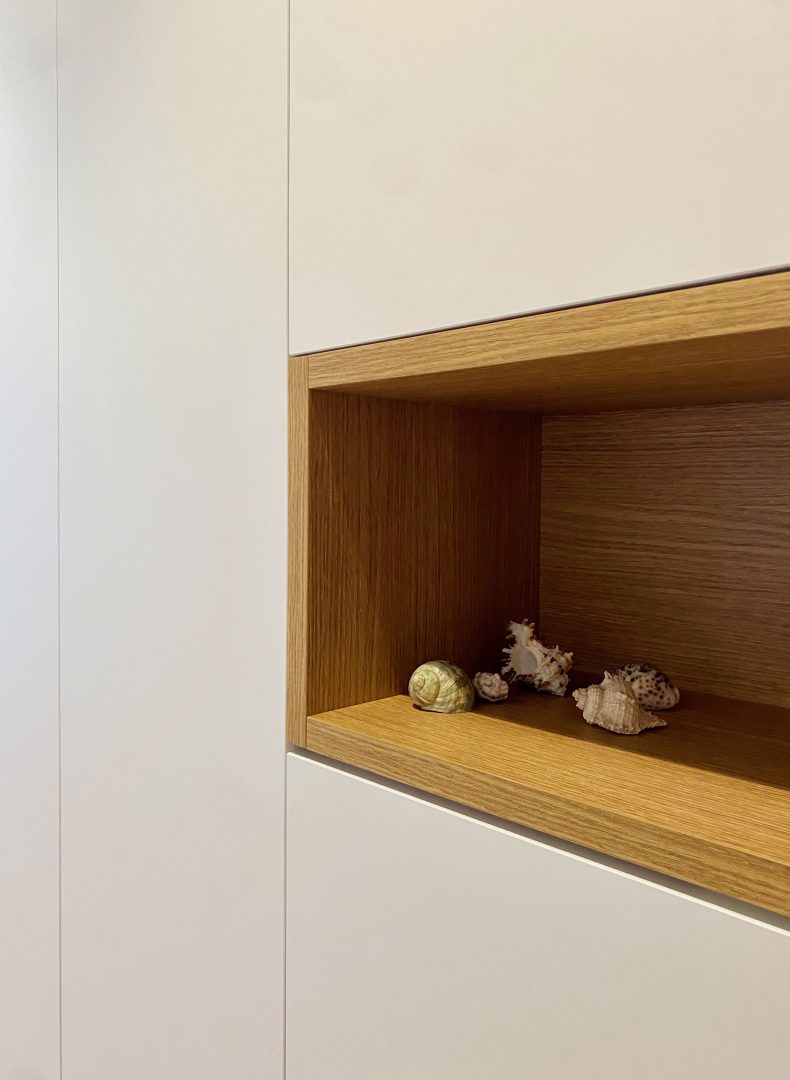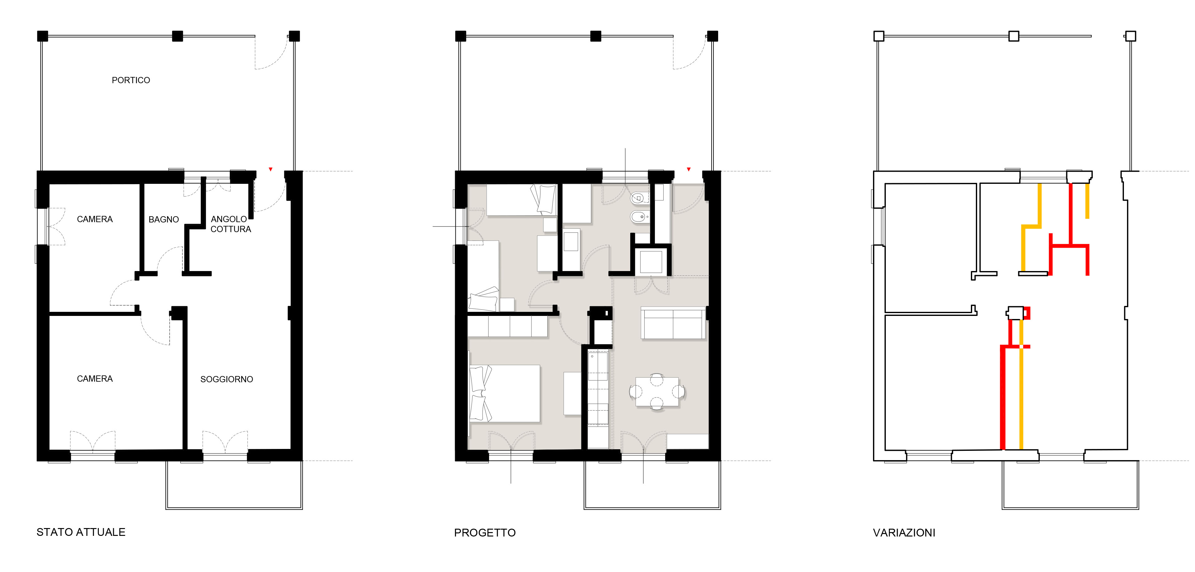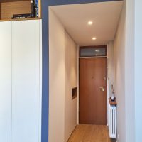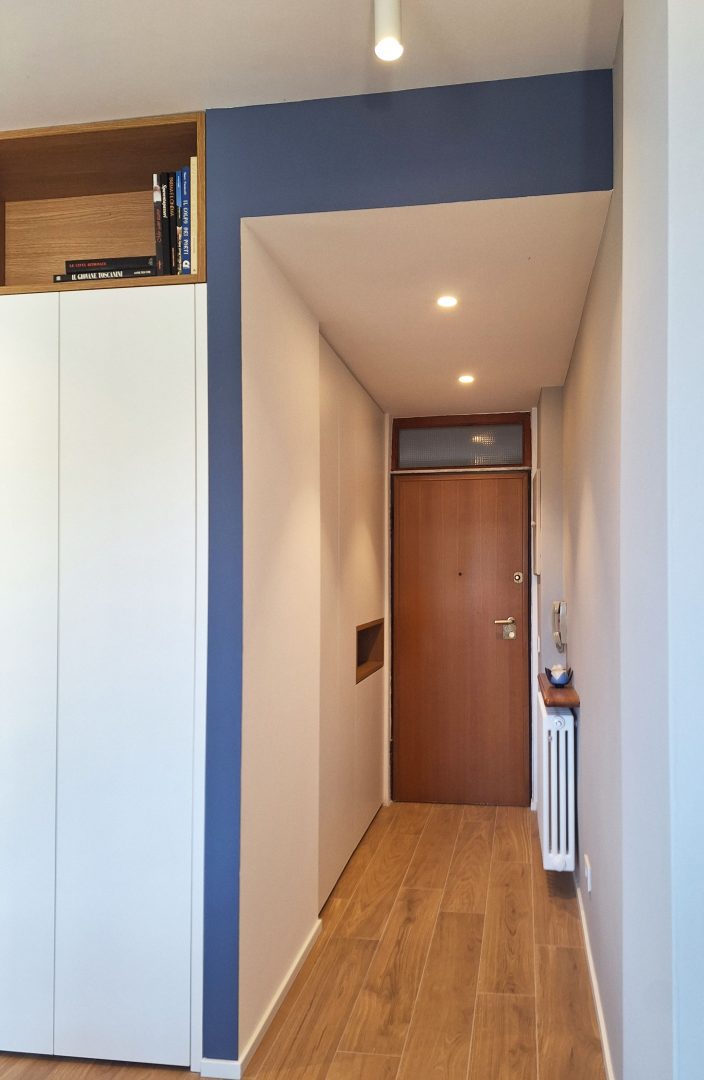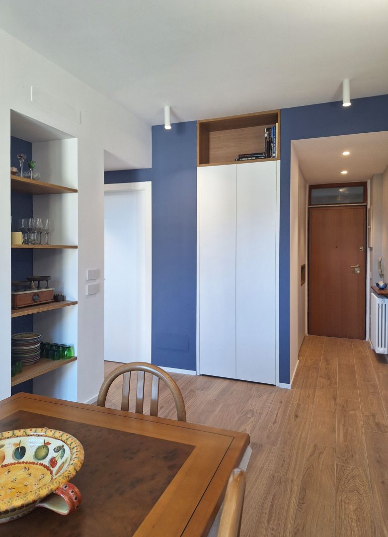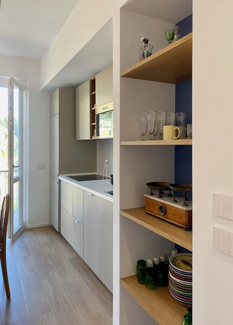 Per prima cosa è stata rivista la distribuzione, allargando il bagno come da richiesta dei clienti. La cucina è stata quindi spostata verso l'affaccio principale e al suo posto sono stati ricavato due ambienti di servizio: un ripostiglio e un mobile ingresso.
