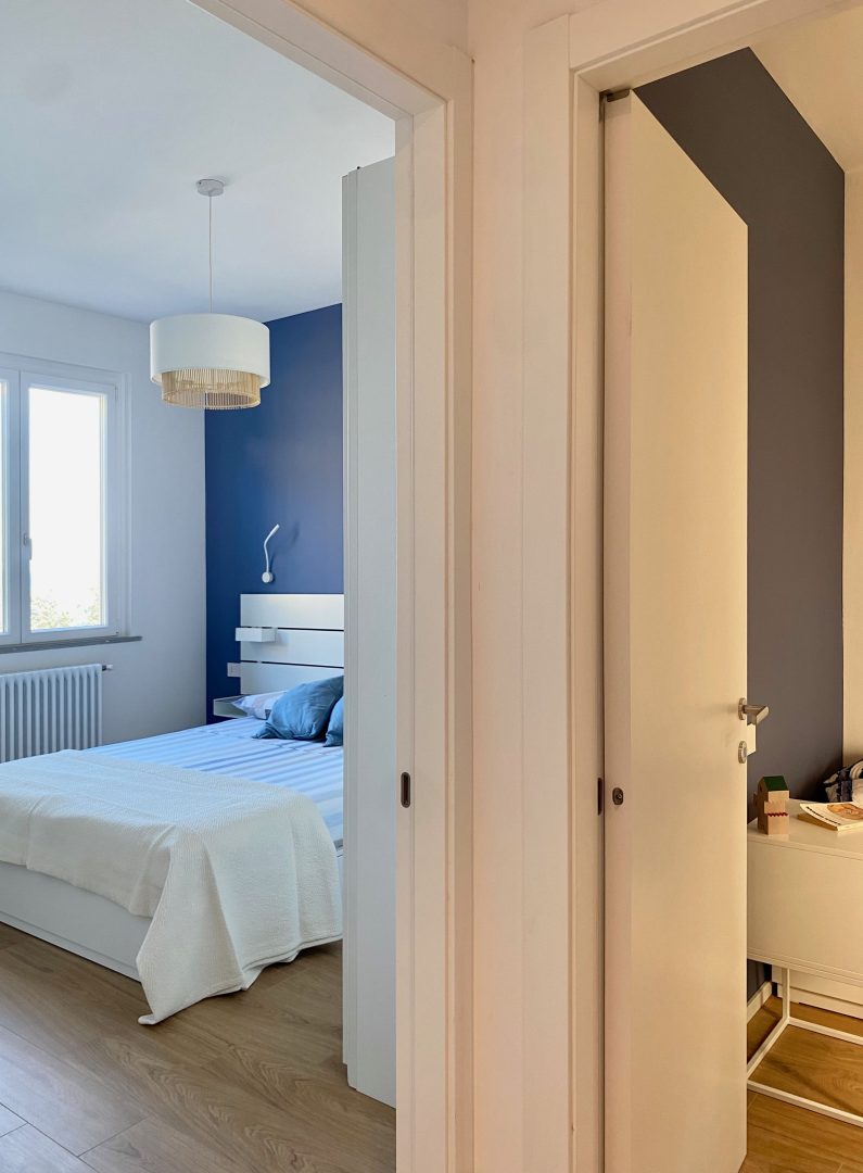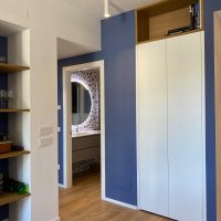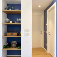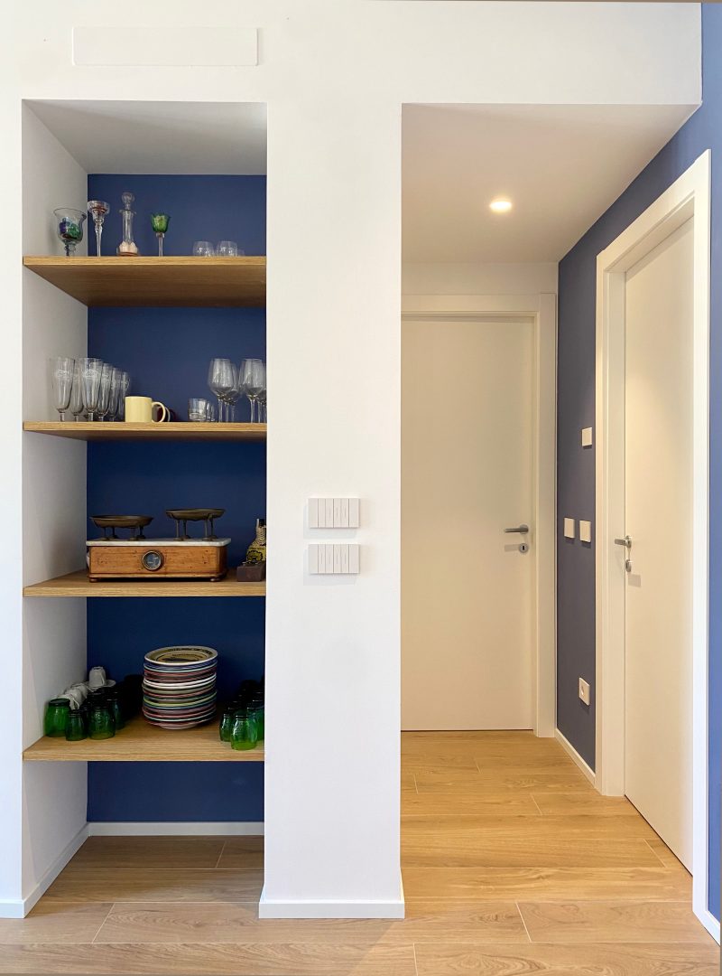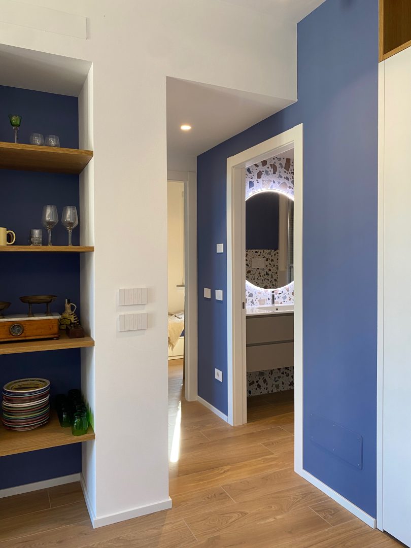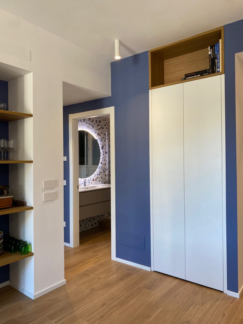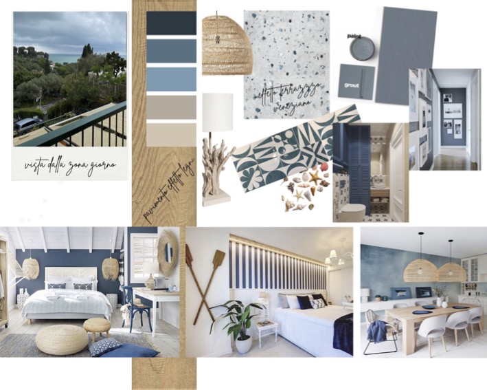 Per le finiture sono stati scelti materiali pratici, adatti ad una seconda casa al mare: gres effetto legno color rovere per il pavimento di tutte le stanze e a rivestimento del bagno un gres effetto terrazzo veneziano, che riprende la palette cromatica scelta per questi ambienti. Per quanto riguarda i colori domina e caratterizza tutto l'appartamento un blu leggermente desaturato, deciso ma allo stesso tempo rilassante, abbinato al bianco e a un sabbia, presente a parete nella zona giorno e che riprende il colore dei mobili della cucina.