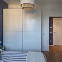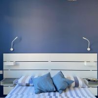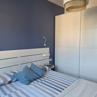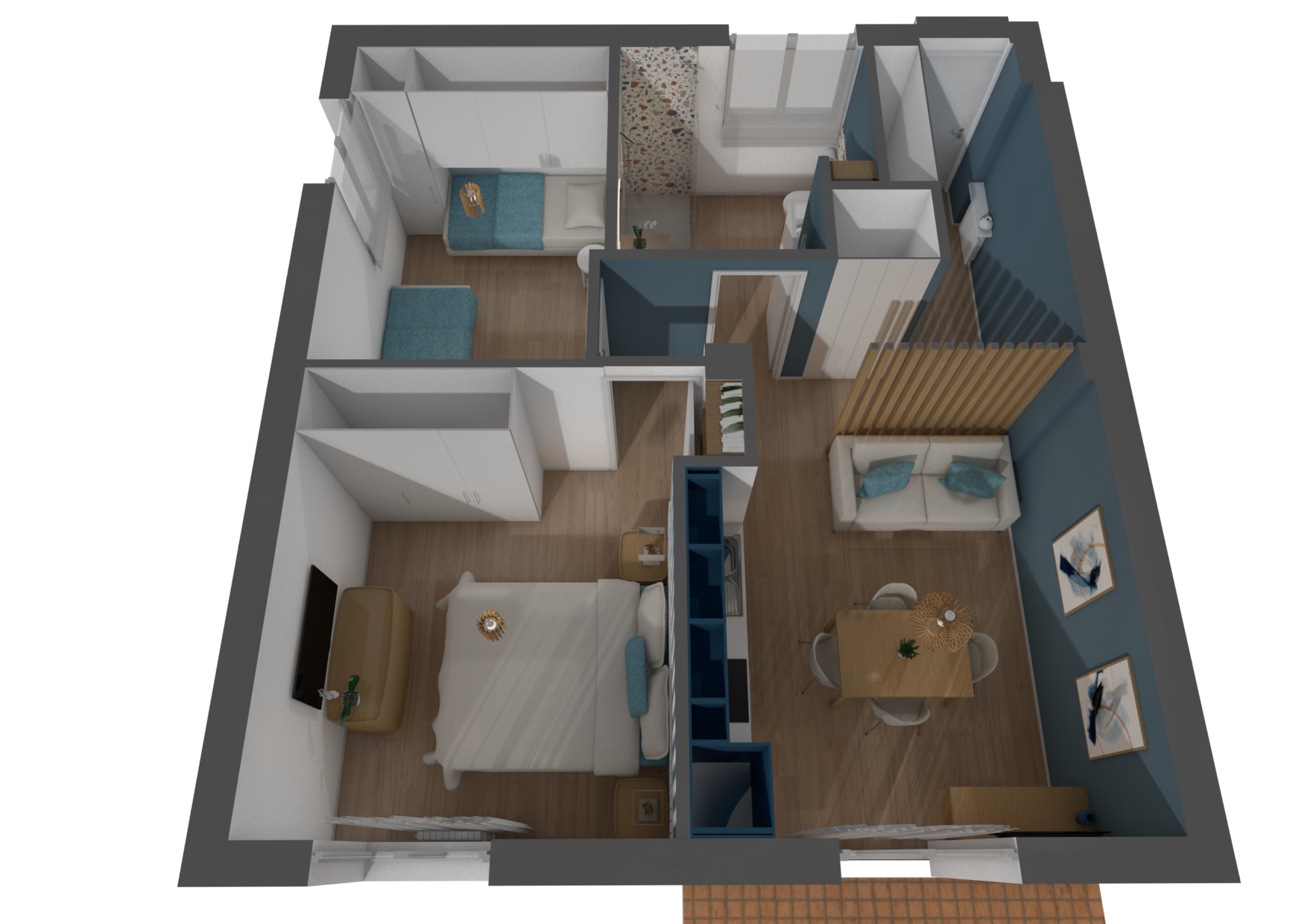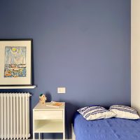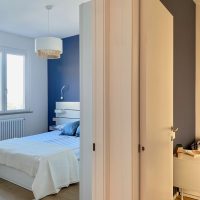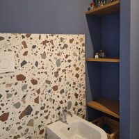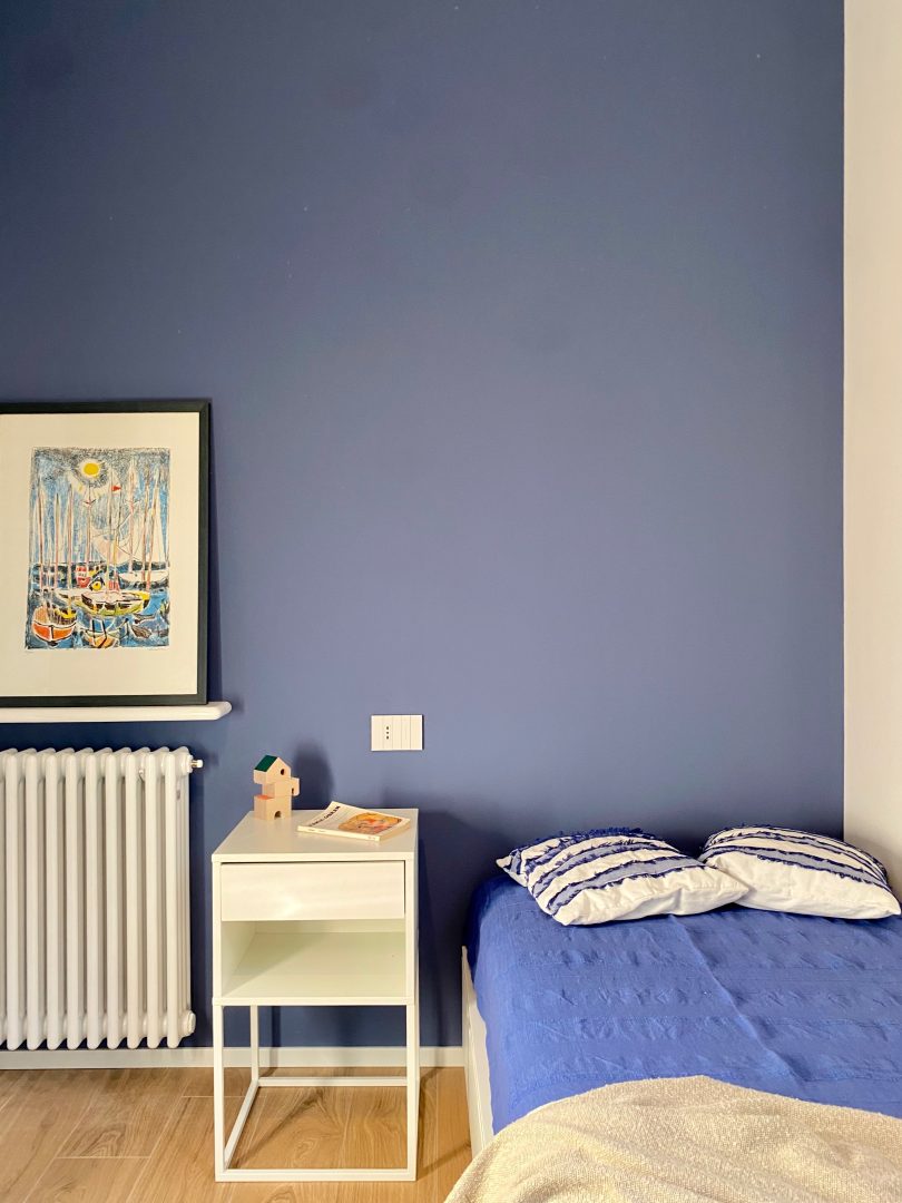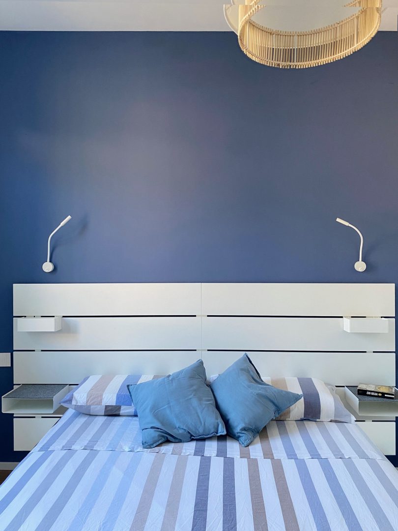 Per le finiture sono stati scelti materiali pratici, adatti ad una seconda casa al mare: gres effetto legno color rovere per il pavimento di tutte le stanze e a rivestimento del bagno un gres effetto terrazzo veneziano, che riprende la palette cromatica scelta per questi ambienti. Per quanto riguarda i colori domina e caratterizza tutto l'appartamento un blu leggermente desaturato, deciso ma allo stesso tempo rilassante, abbinato al bianco e a un sabbia, presente a parete nella zona giorno e che riprende il colore dei mobili della cucina.