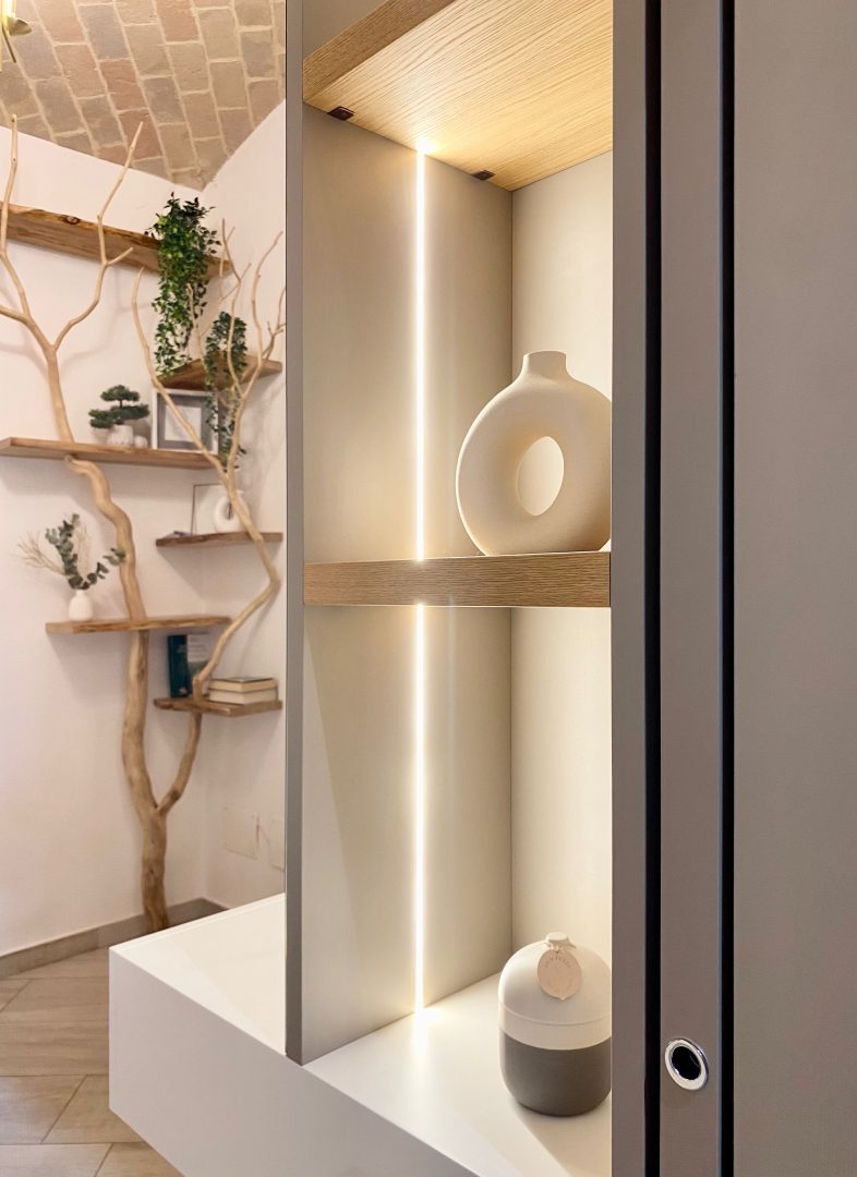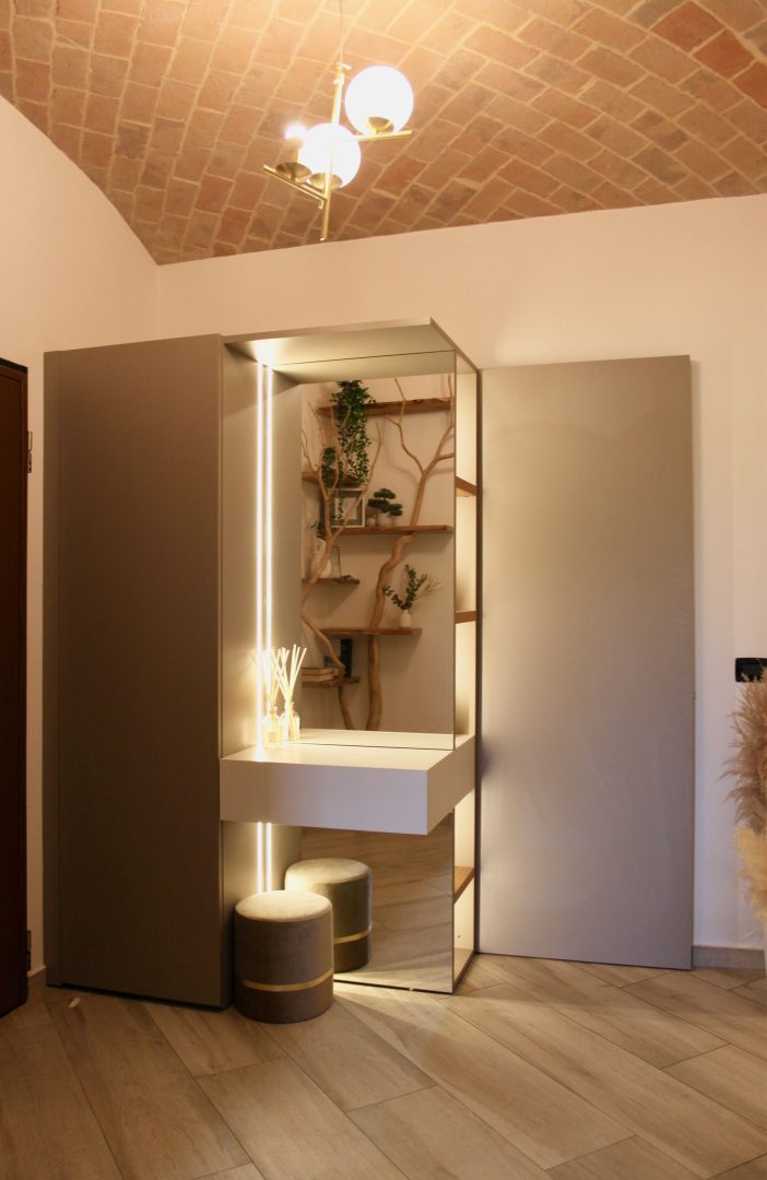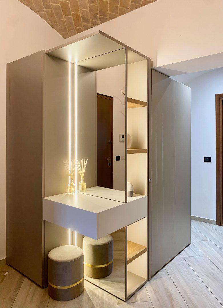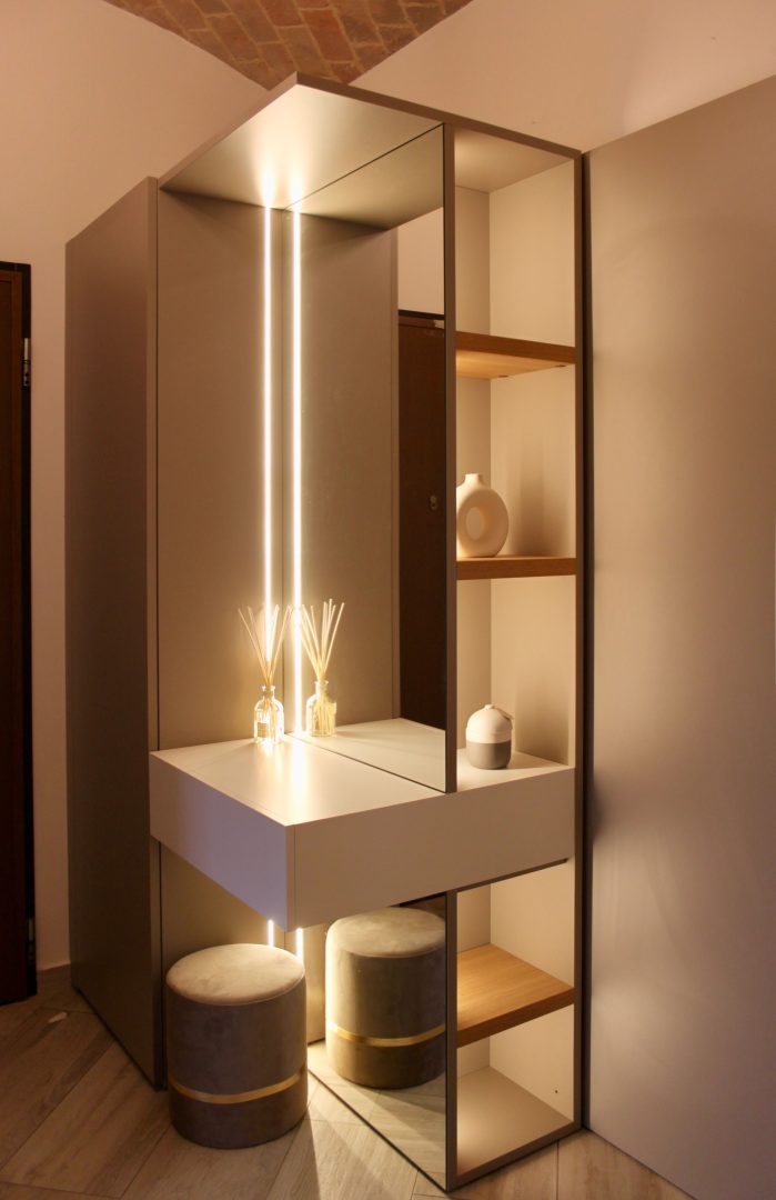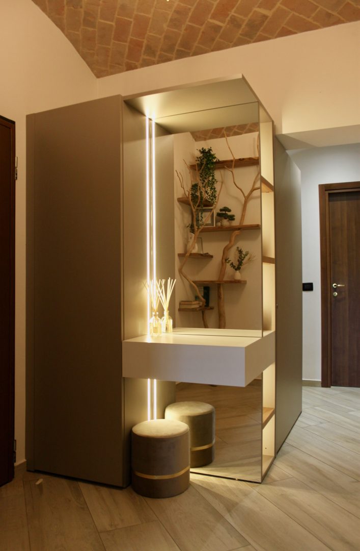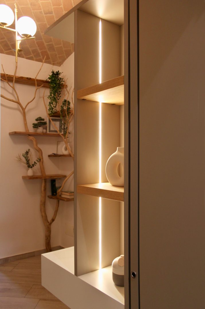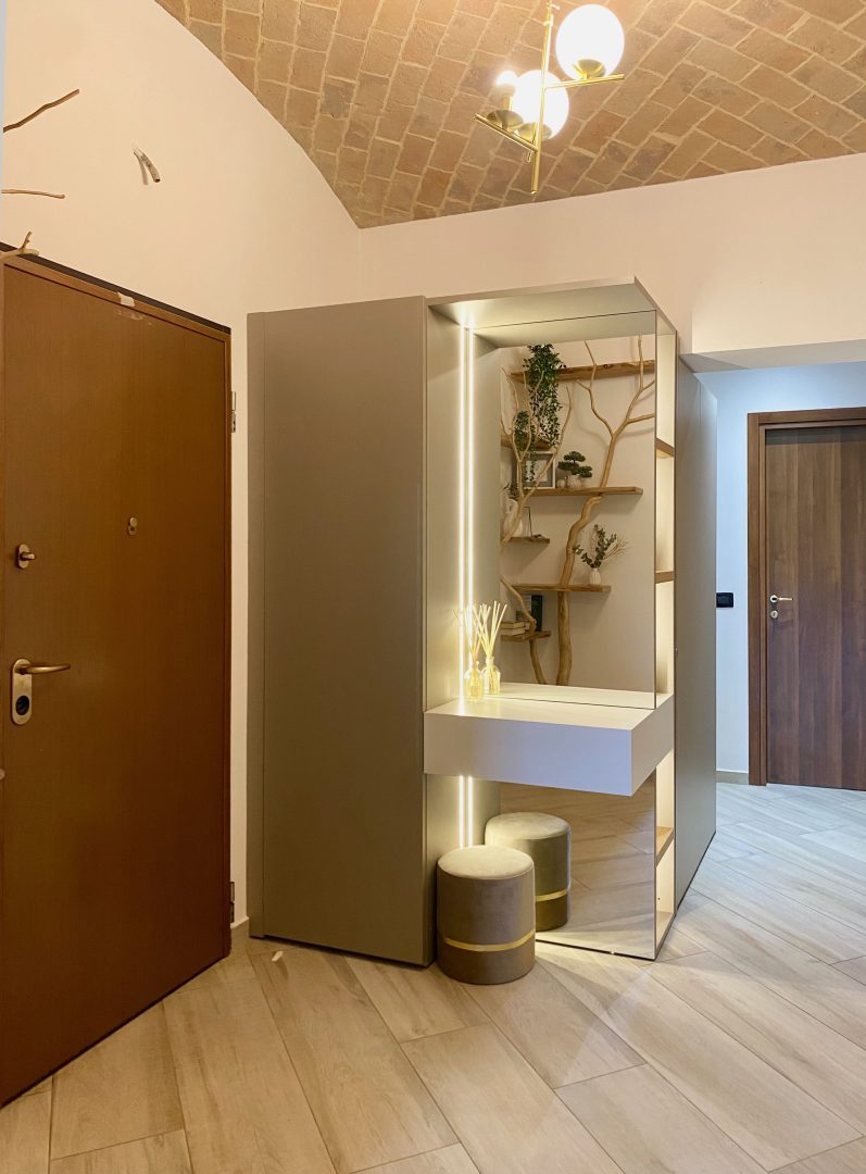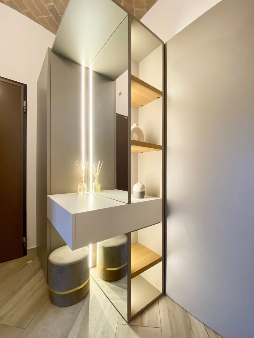 Abbiamo realizzato una prima parte a cappottiera che consente di nascondere gli impianti lasciandoli comunque accessibili; il mobile continua poi con una mensola/cassetto svuotatasche con specchio e luce led, una zona libreria a giorno sul fianco. Qui fra i due mobili, trova posto una porta completamente a scomparsa, perfettamente integrata, che divide all’occorrenza l’ingresso dalla zona notte. Termina un armadio a due ante con ripiani che entra nel disimpegno sfruttando al massimo anche questo spazio.
