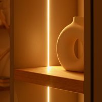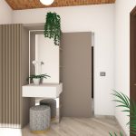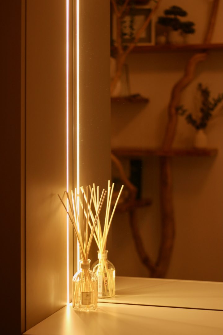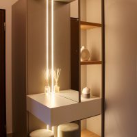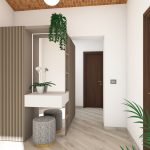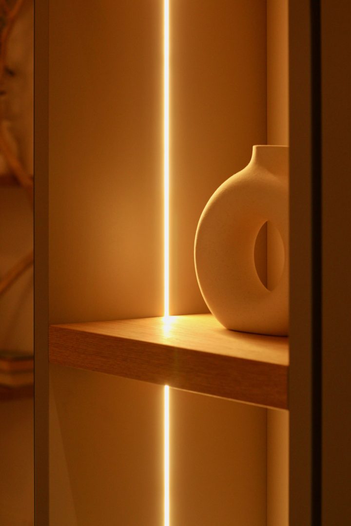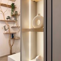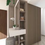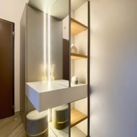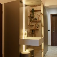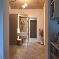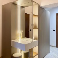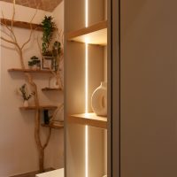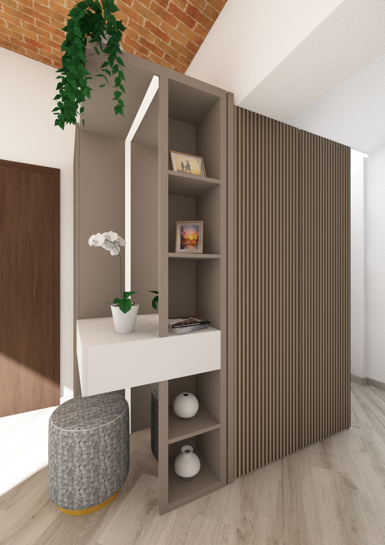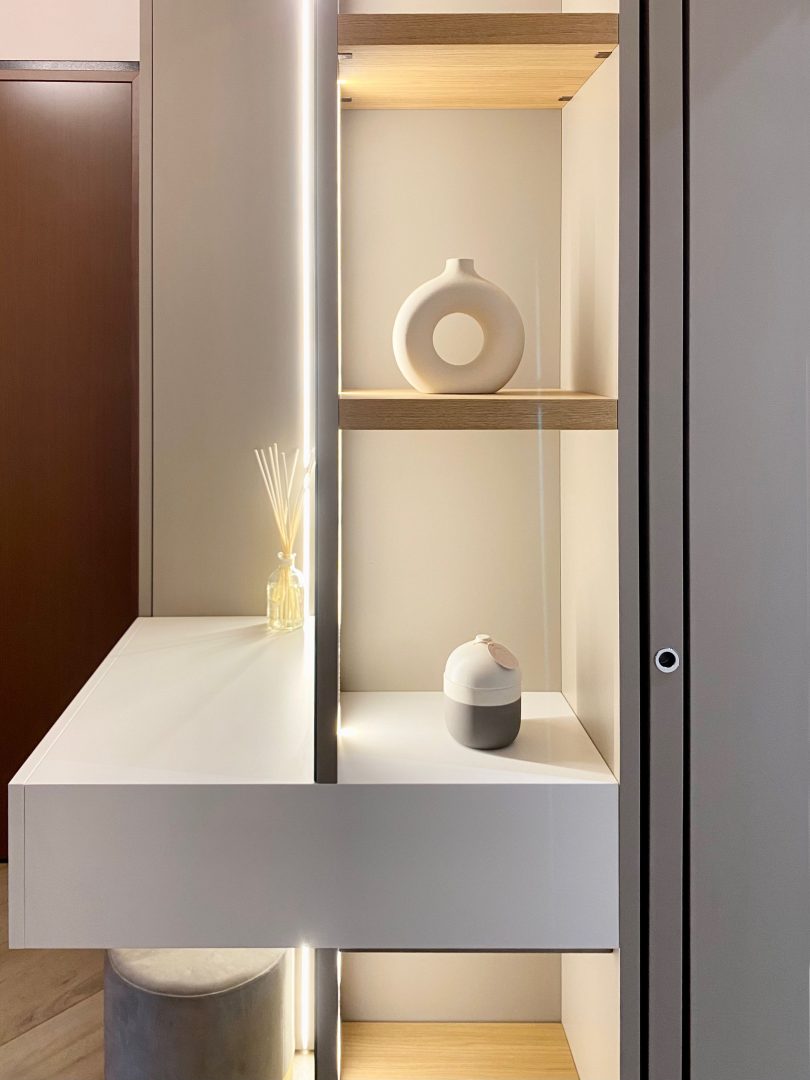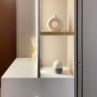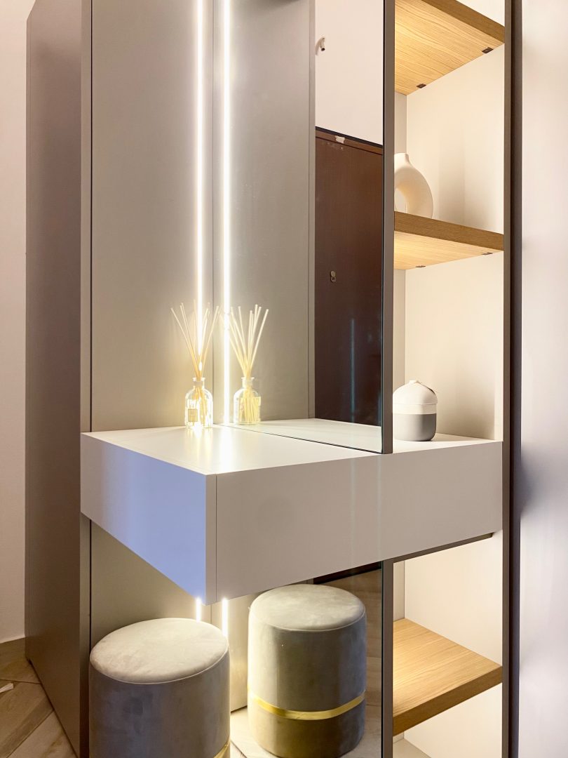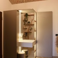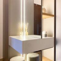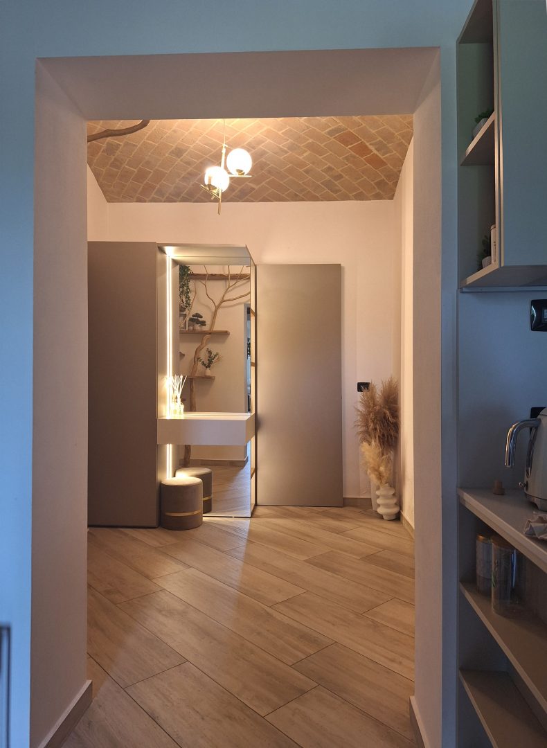 Abbiamo realizzato una prima parte a cappottiera che consente di nascondere gli impianti lasciandoli comunque accessibili; il mobile continua poi con una mensola/cassetto svuotatasche con specchio e luce led, una zona libreria a giorno sul fianco. Qui fra i due mobili, trova posto una porta completamente a scomparsa, perfettamente integrata, che divide all’occorrenza l’ingresso dalla zona notte. Termina un armadio a due ante con ripiani che entra nel disimpegno sfruttando al massimo anche questo spazio.