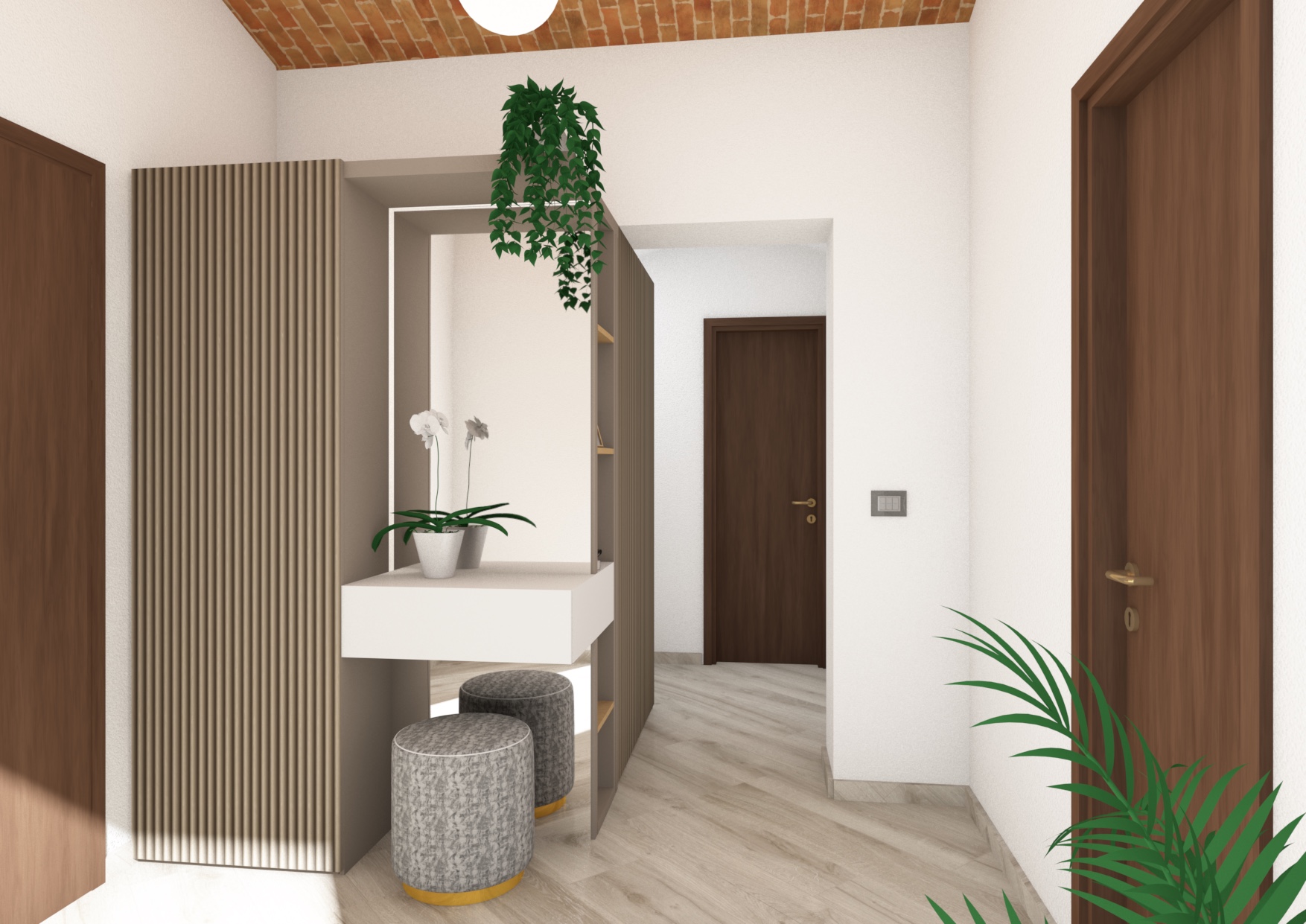 L’ampio ingresso con volta a botte in mattoni faccia a vista si presentava sostanzialmente vuoto, da valorizzare e rendere funzionale. I Committenti chiedevano qualcosa di elegante ma con tanto spazio contenitivo; inoltre volevano poter dividere l’ingresso dal disimpegno della zona notte e mascherare alcuni elementi impiantistici.