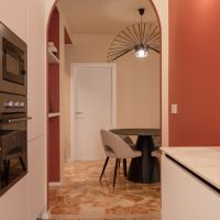 Per quanto riguarda gli ambienti abbiamo allargato il bagno principale, ricavando anche un antibagno per la lavatrice, e aperto la cucina sul disimpegno tramite un arco. Il disimpegno così è diventato parte della zona giorno come saletta comune.