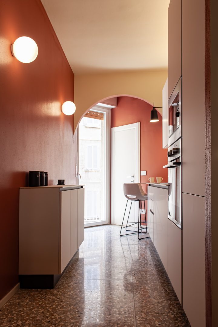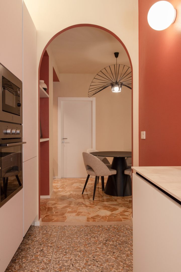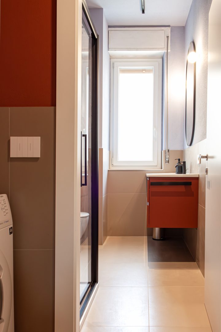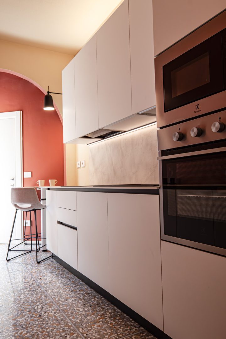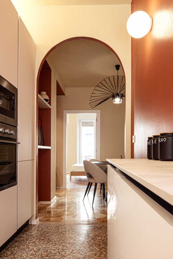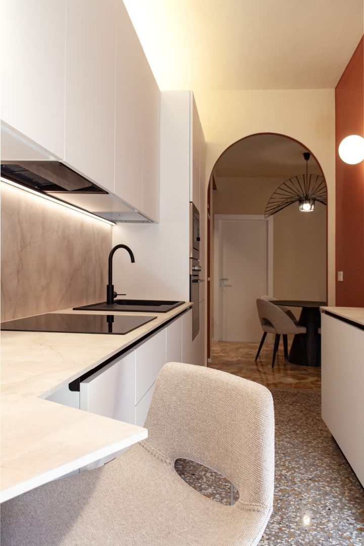 Per quanto riguarda gli ambienti abbiamo allargato il bagno principale, ricavando anche un antibagno per la lavatrice, e aperto la cucina sul disimpegno tramite un arco. Il disimpegno così è diventato parte della zona giorno come saletta comune.