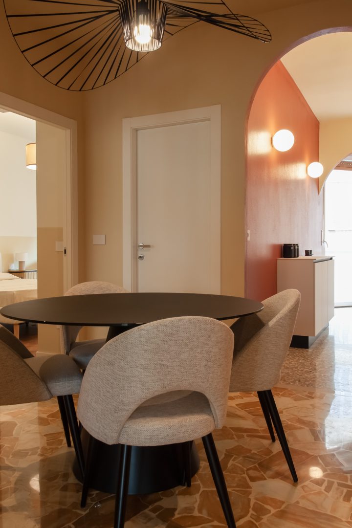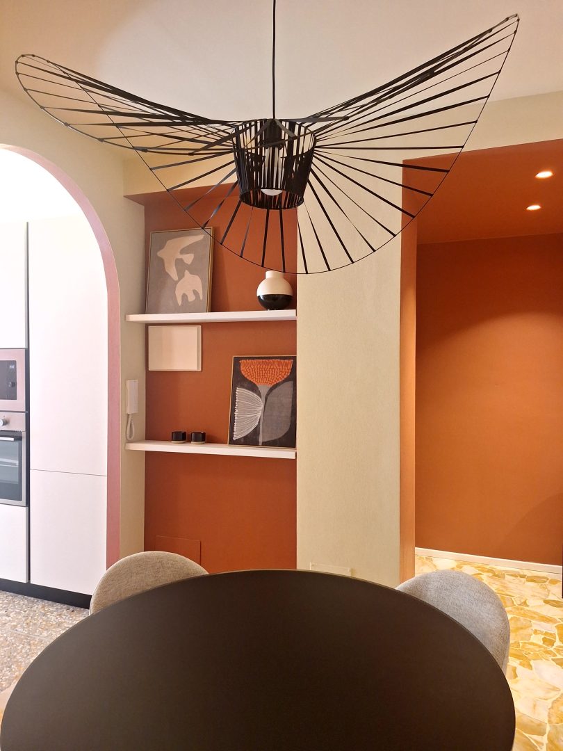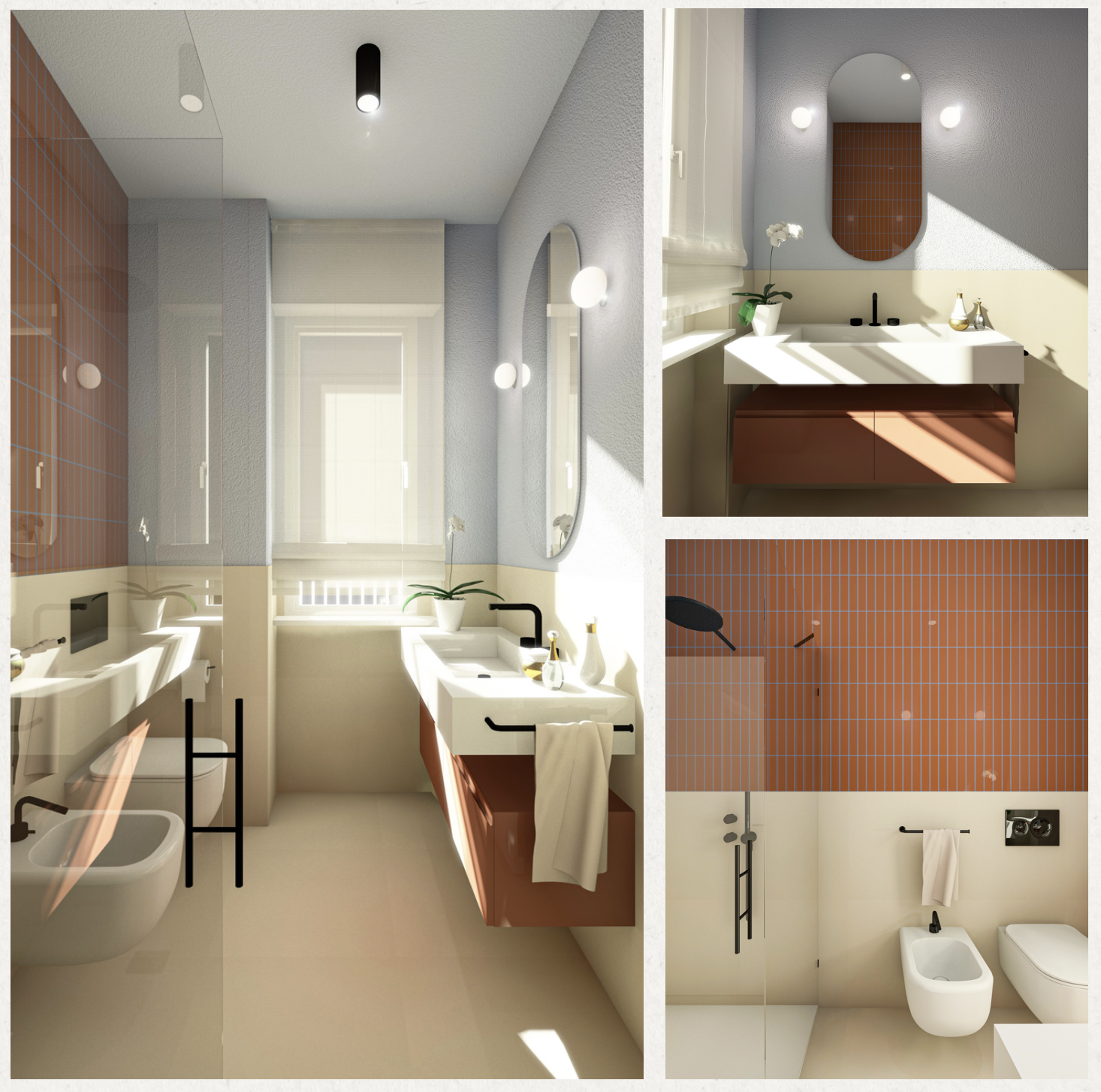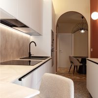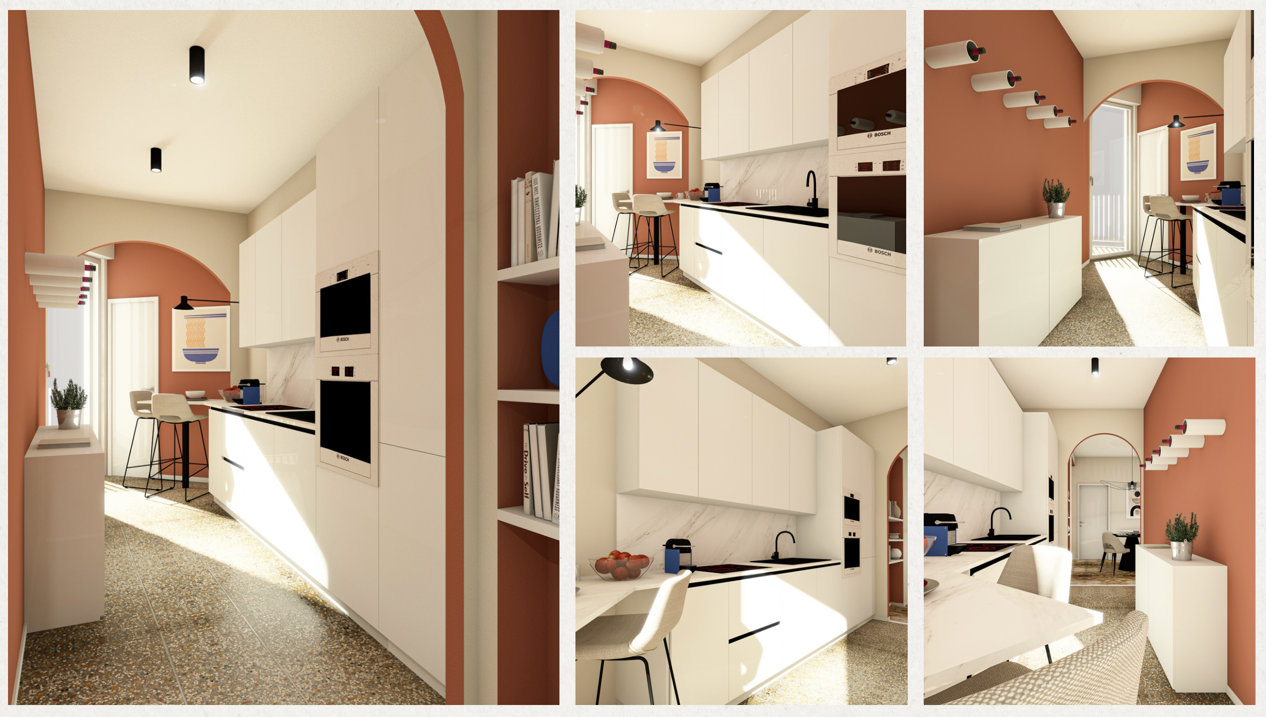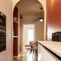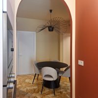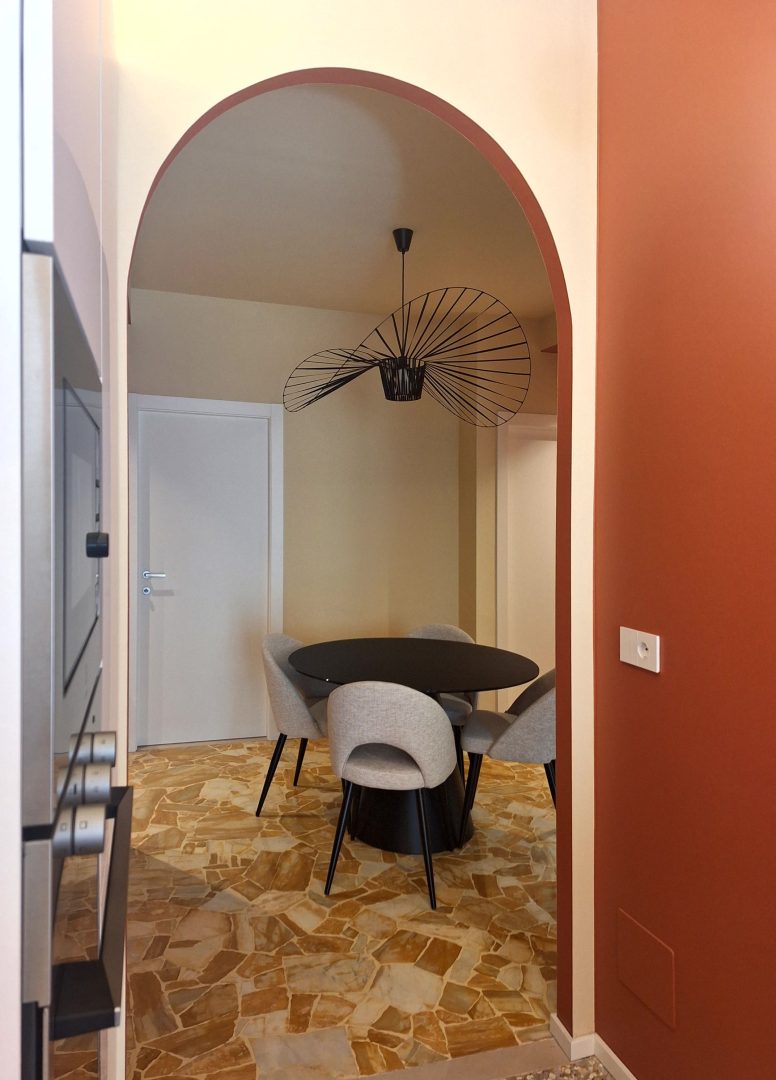 Per quanto riguarda gli ambienti abbiamo allargato il bagno principale, ricavando anche un antibagno per la lavatrice, e aperto la cucina sul disimpegno tramite un arco. Il disimpegno così è diventato parte della zona giorno come saletta comune.